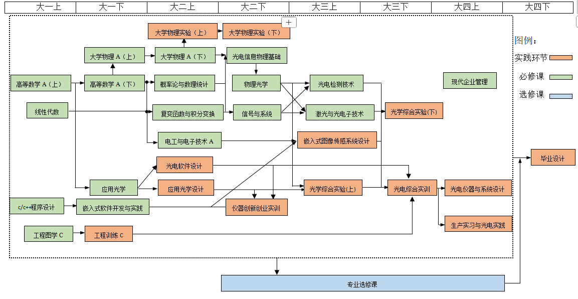 培养目标:本专业培养符合光电信息科学与工程领域发展需求,具备健全人格、高度的社会责任感、开阔的国际视野、良好的人文素养和求实进取精神,以及扎实的自然科学基础知识、宽厚的专业知识、较强的工程实践能力,具有良好的创新意识、沟通协作和终身学习能力,在光电成像与显示、光电传感与测试等领域从事科学研究、产品开发、项目管理工作的高层次工程技术人才。