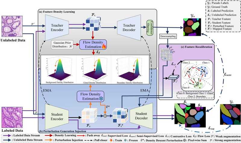 针对上述问题,团队提出了基于密度扰动与特征重校准的半监督方法DPFR:构建归一化流密度估计器对腺体、轮廓与背景的特征分布进行建模,并利用梯度引导的密度扰动增强特征可分性;同时引入对比学习驱动的特征重校准模块,缓解类间混淆,降低粘连对边界分割的不利影响。实验结果表明,DPFR能够取得优于现有主流半监督方法的分割性能。该项研究提出的半监督腺体分割方法在减少对大规模精细标注依赖的同时显著提升了分割效果,为结直肠癌与前列腺癌组织病理图像的自动分析提供了理论方法和关键技术支撑,对于上述疾病的智能诊断具有重要意义。