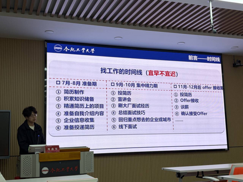 周鑫发聚焦求职全周期执行要点,强调“宜早不宜迟”。他以硬件系统工程师岗位为例,详细拆解了7月至12月的求职时间线。他建议同学们注意打磨简历,精通项目等细节,在多关注学校宣讲会的同时做好简历投递的记录。针对面试环节,做到多复盘,多总结。